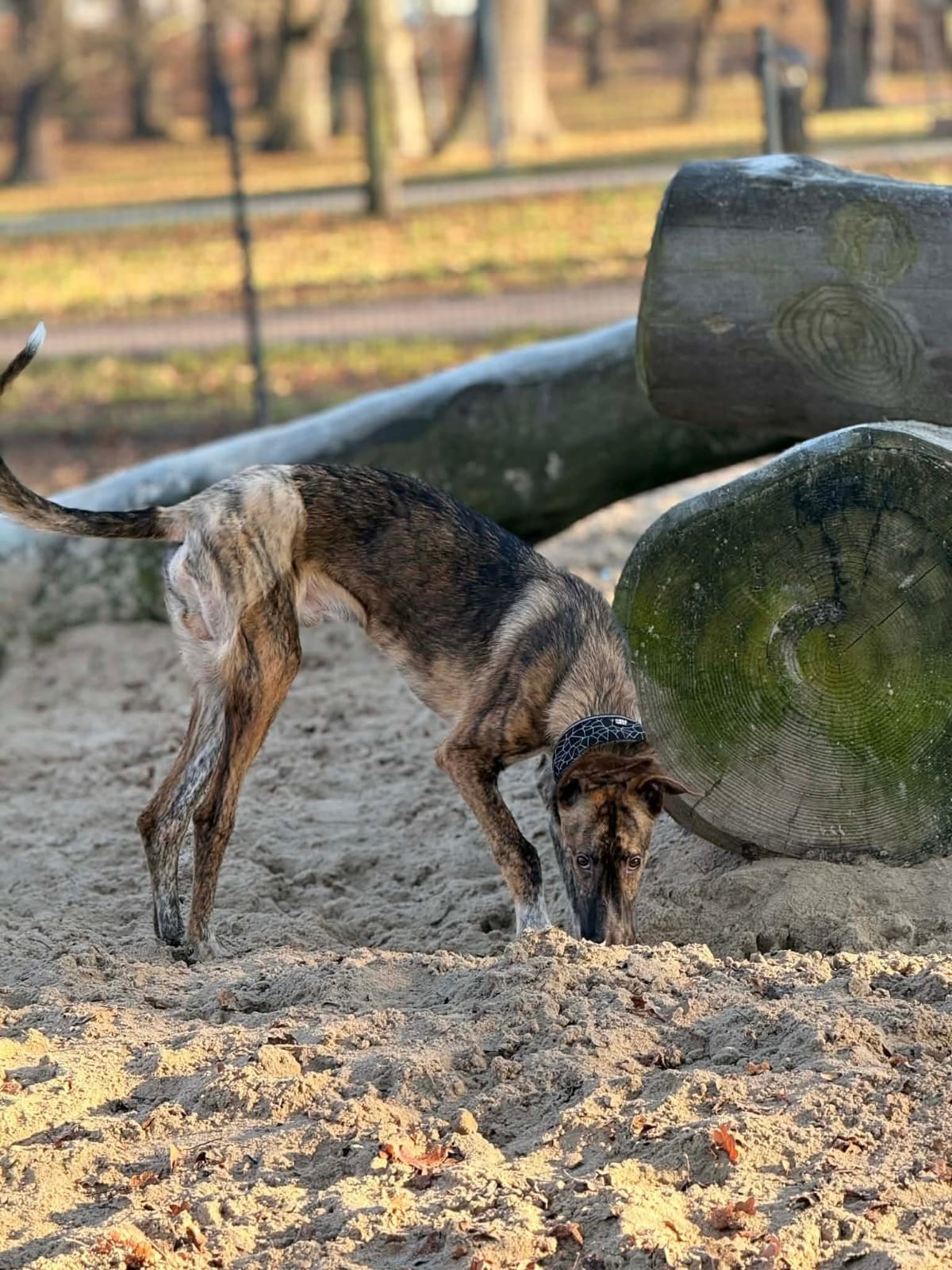 Czaruś to pies mocno w typie charta. Jest jeszcze szczeniakiem, bo ma około 7 miesięcy. Mimo trudnego startu w życiu pokazuje, jak wspaniałym może być towarzyszem człowieka. Po przebytym wypadku wraca do formy i dziś z radością nadrabia zaległości – ruch to jego żywioł!