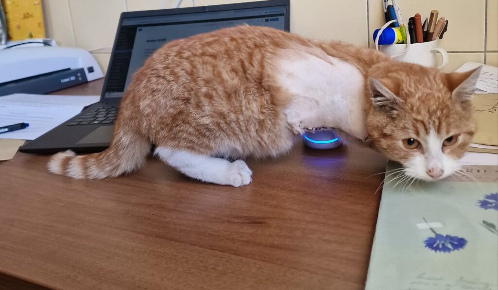 Marcyś jest dzielnym malcem – czuje się już bardzo dobrze i rozpoczął naukę chodzenia na trzech łapkach, co wychodzi mu wzorowo. To kotek łagodny, przyjazny i bardzo ciekawy świata.