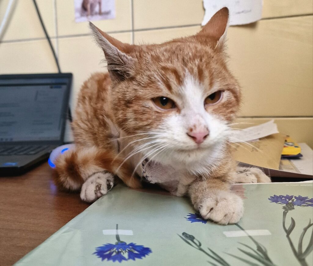 Marcyś to malutki, 6-miesięczny kotek, który trafił do schroniska 1 stycznia w stanie krytycznym. Maluch miał zmiażdżoną łapkę oraz poważną ranę szyi. Natychmiast otrzymał pomoc od naszych wspaniałych lekarzy, dzięki którym udało się go uratować. Niestety, łapka musiała zostać amputowana.